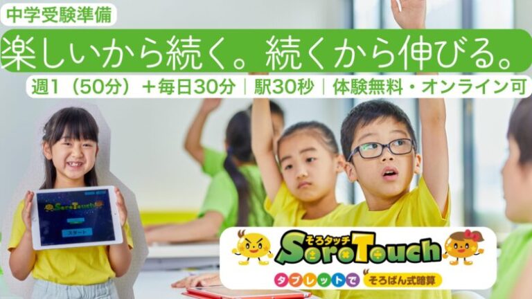 狛江市・和泉多摩川駅30秒|5–8歳の“受験準備ベースキャンプ”——そろばん式暗算×習慣化のそろタッチ和泉多摩川校 5歳〜8歳から始める、未来につながる学び。 楽しいから続く。続くから伸びる。 週1(50分)+毎日30分 … 続きを読む オンライン説明会・個別説明・授業体験の予約|そろタッチ和泉多摩川校(狛江市)